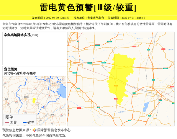 辛集市气象台2022年06月30日12时16分发布雷电黄色预警信号:预计今天下午到夜间,我市全部乡镇有分散性雷阵雨,雷雨时伴有短时强降水、短时大风等强对流天气,请有关单位和人员做好防范准备。 信息来源:国家预警信息发布中心; 发布单位:辛集市气象台。