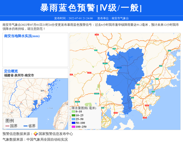 南安市气象台2022年07月01日21时24分变更发布暴雨蓝色预警信号:过去6小时我市蓬华镇降雨量达91.2毫米,预计未来12小时我市强降水仍将持续,请注意防范! 信息来源:国家预警信息发布中心; 发布单位:南安市气象台。