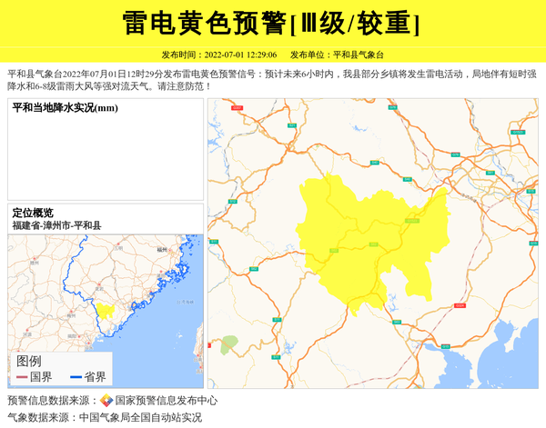 平和县气象台2022年07月01日12时29分发布雷电黄色预警信号:预计未来6小时内,我县部分乡镇将发生雷电活动,局地伴有短时强降水和6-8级雷雨大风等强对流天气。请注意防范! 信息来源:国家预警信息发布中心; 发布单位:平和县气象台。