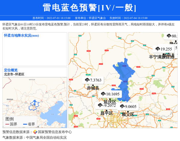 怀柔区气象台发布雷电蓝色预警[IV/一般]