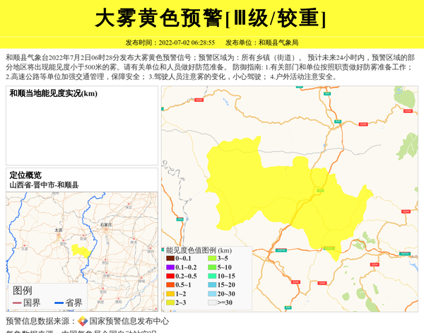 和顺县气象台2022年7月2日06时28分发布大雾黄色预警信号;预警区域为:所有乡镇(街道)。 预计未来24小时内,预警区域的部分地区将出现能见度小于500米的雾。请有关单位和人员做好防范准备。 防御指南: 1.有关部门和单位按照职责做好防雾准备工作; 2.高速公路等单位加强交通管理,保障安全; 3.驾驶人员注意雾的变化,小心驾驶; 4.户外活动注意安全。 信息来源:国家预警信息发布中心; 发布单位:和顺县气象局。