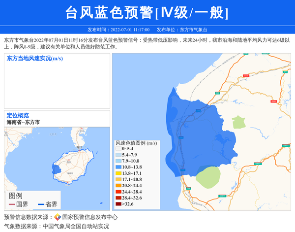 东方市气象台2022年07月01日11时16分发布台风蓝色预警信号:受热带低压影响,未来24小时,我市沿海和陆地平均风力可达6级以上,阵风8-9级,建议有关单位和人员做好防范工作。 信息来源:国家预警信息发布中心; 发布单位:东方市气象台。