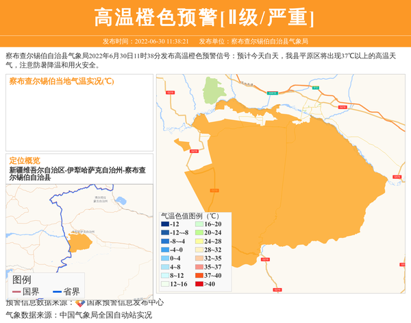 察布查尔锡伯自治县气象局2022年6月30日11时38分发布高温橙色预警信号:预计今天白天,我县平原区将出现37℃以上的高温天气,注意防暑降温和用火安全。 信息来源:国家预警信息发布中心; 发布单位:察布查尔锡伯自治县气象局。