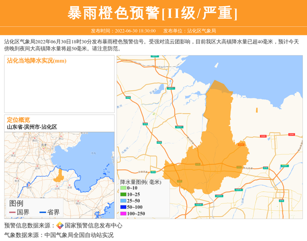 沾化区气象局2022年06月30日18时30分发布暴雨橙色预警信号。受强对流云团影响,目前我区大高镇降水量已超40毫米,预计今天傍晚到夜间大高镇降水量将超50毫米。请注意防范。 信息来源:国家预警信息发布中心; 发布单位:沾化区气象局。