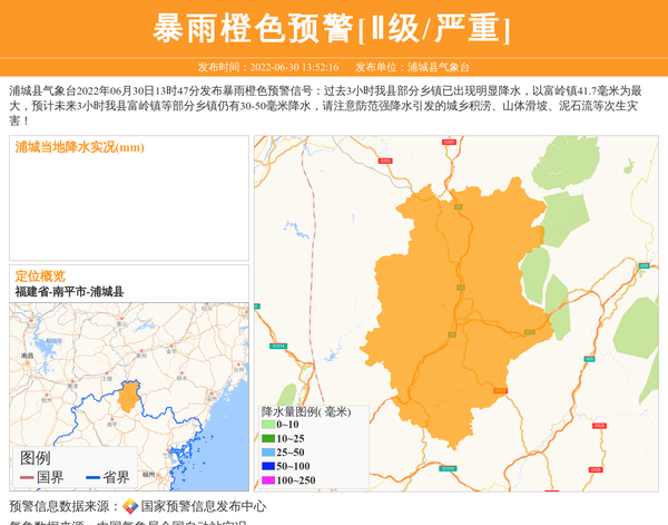 浦城县气象台2022年06月30日13时47分发布暴雨橙色预警信号:过去3小时我县部分乡镇已出现明显降水,以富岭镇41.7毫米为最大,预计未来3小时我县富岭镇等部分乡镇仍有30-50毫米降水,请注意防范强降水引发的城乡积涝、山体滑坡、泥石流等次生灾害! 信息来源:国家预警信息发布中心; 发布单位:浦城县气象台。