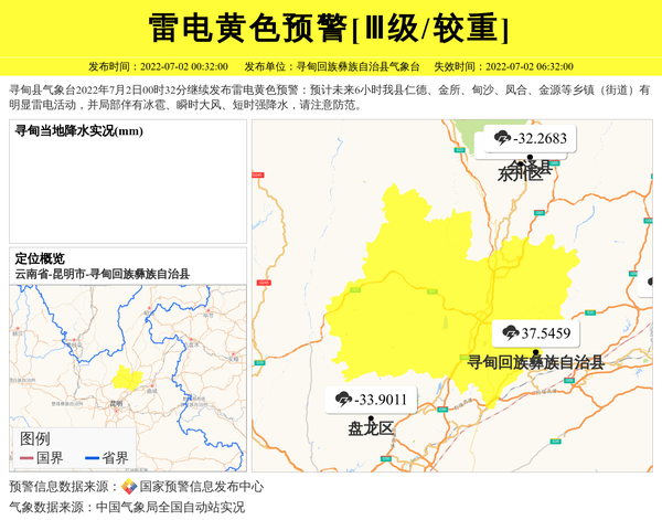 寻甸县气象台2022年7月2日00时32分继续发布雷电黄色预警:预计未来6小时我县仁德、金所、甸沙、凤合、金源等乡镇(街道)有明显雷电活动,并局部伴有冰雹、瞬时大风、短时强降水,请注意防范。 信息来源:国家预警信息发布中心; 发布单位:寻甸回族彝族自治县气象台。