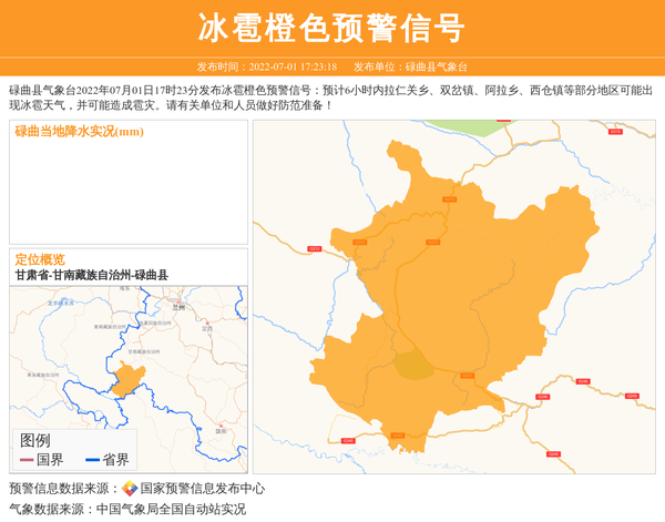 碌曲县气象台2022年07月01日17时23分发布冰雹橙色预警信号:预计6小时内拉仁关乡、双岔镇、阿拉乡、西仓镇等部分地区可能出现冰雹天气,并可能造成雹灾。请有关单位和人员做好防范准备! 信息来源:国家预警信息发布中心; 发布单位:碌曲县气象台。