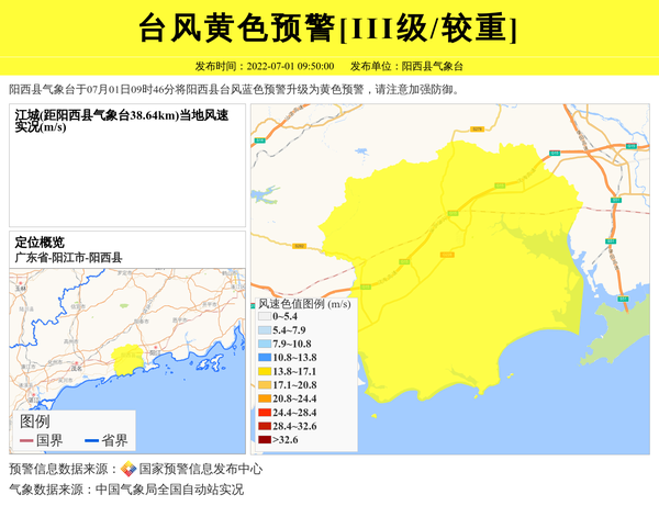 阳西县气象台于07月01日09时46分将阳西县台风蓝色预警升级为黄色预警,请注意加强防御。 信息来源:国家预警信息发布中心; 发布单位:阳西县气象台。