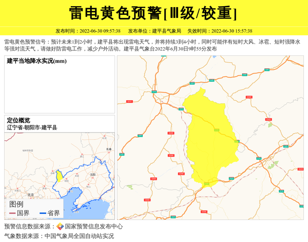 雷电黄色预警信号:预计未来1到2小时,建平县将出现雷电天气,并将持续3到4小时,同时可能伴有短时大风、冰雹、短时强降水等强对流天气,请做好防雷电工作,减少户外活动。建平县气象台2022年6月30日9时55分发布 信息来源:国家预警信息发布中心; 发布单位:建平县气象局。