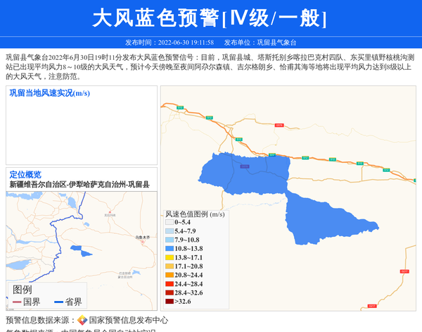 巩留县气象台发布大风蓝色预警[Ⅳ级/一般]