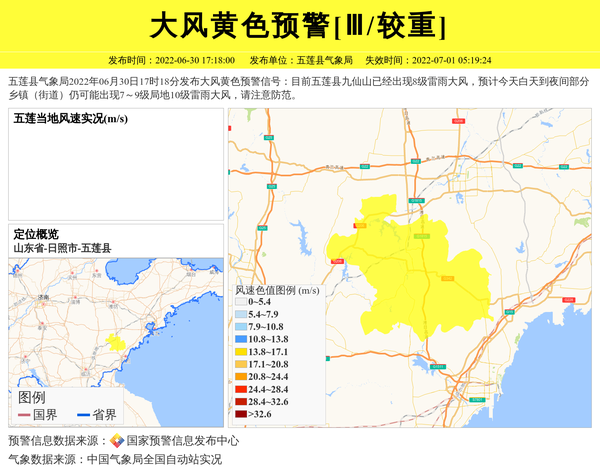 五莲县气象局2022年06月30日17时18分发布大风黄色预警信号:目前五莲县九仙山已经出现8级雷雨大风,预计今天白天到夜间部分乡镇(街道)仍可能出现7~9级局地10级雷雨大风,请注意防范。 信息来源:国家预警信息发布中心; 发布单位:五莲县气象局。