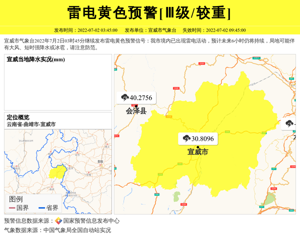 宣威市气象台2022年7月2日03时45分继续发布雷电黄色预警信号:我市境内已出现雷电活动,预计未来6小时仍将持续,局地可能伴有大风、短时强降水或冰雹,请注意防范。 信息来源:国家预警信息发布中心; 发布单位:宣威市气象台。