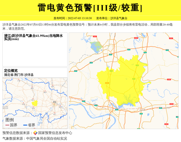 沙洋县气象台2022年07月03日13时06分发布雷电黄色预警信号:预计未来6小时,我县部分乡镇将有雷电活动,局部雨量20-40毫米,请注意防范。 信息来源:国家预警信息发布中心; 发布单位:沙洋县气象台。