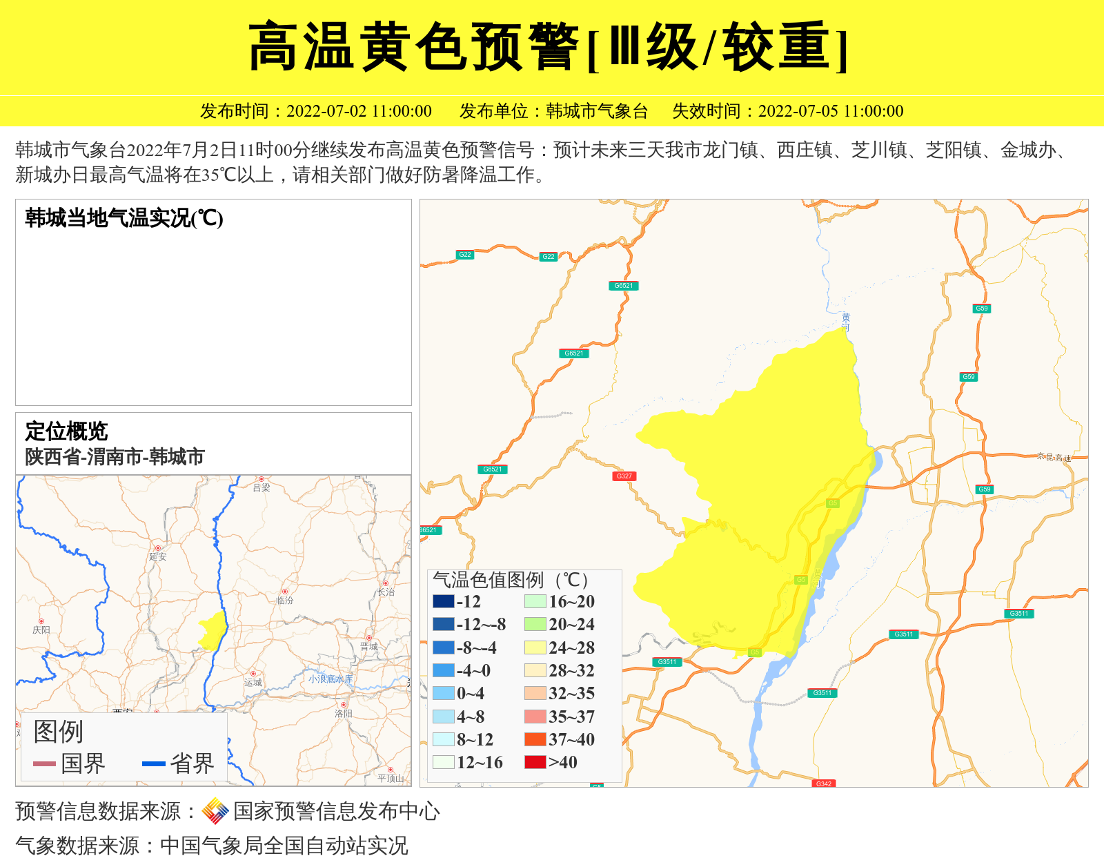 韩城市气象台2022年7月2日11时00分继续发布高温黄色预警信号:预计未来三天我市龙门镇、西庄镇、芝川镇、芝阳镇、金城办、新城办日最高气温将在35℃以上,请相关部门做好防暑降温工作。 信息来源:国家预警信息发布中心; 发布单位:韩城市气象台。