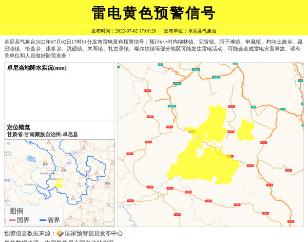 卓尼县气象台2022年07月02日17时01分发布雷电黄色预警信号:预计6小时内柳林镇、完冒镇、阿子滩镇、申藏镇、杓哇土族乡、藏巴哇镇、恰盖乡、康多乡、洮砚镇、木耳镇、扎古录镇、喀尔钦镇等部分地区可能发生雷电活动,可能会造成雷电灾害事故。请有关单位和人员做好防范准备! 信息来源:国家预警信息发布中心; 发布单位:卓尼县气象台。