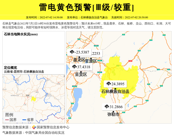 石林彝族自治县气象台发布雷电黄色预警[Ⅲ级/较重]