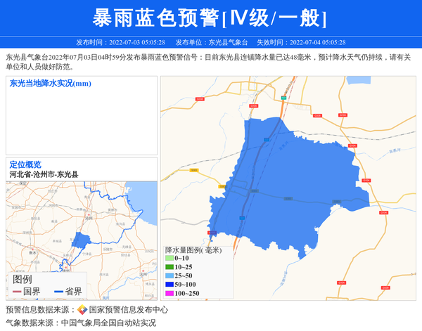 东光县气象台2022年07月03日04时59分发布暴雨蓝色预警信号:目前东光县连镇降水量已达48毫米,预计降水天气仍持续,请有关单位和人员做好防范。 信息来源:国家预警信息发布中心; 发布单位:东光县气象台。
