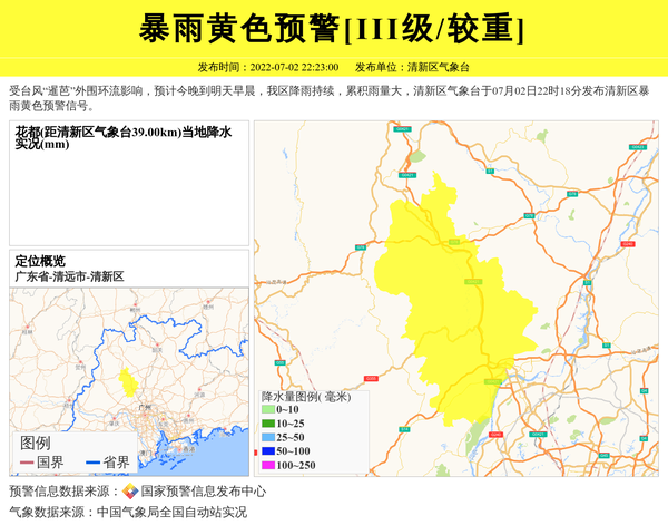 受台风“暹芭”外围环流影响,预计今晚到明天早晨,我区降雨持续,累积雨量大,清新区气象台于07月02日22时18分发布清新区暴雨黄色预警信号。 信息来源:国家预警信息发布中心; 发布单位:清新区气象台。