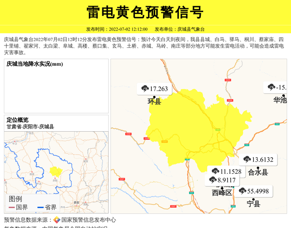 庆城县气象台2022年07月02日12时12分发布雷电黄色预警信号:预计今天白天到夜间,我县县城、白马、驿马、桐川、蔡家庙、四十里铺、翟家河、太白梁、阜城、高楼、蔡口集、玄马、土桥、赤城、马岭、南庄等部分地方可能发生雷电活动,可能会造成雷电灾害事故。 信息来源:国家预警信息发布中心; 发布单位:庆城县气象台。