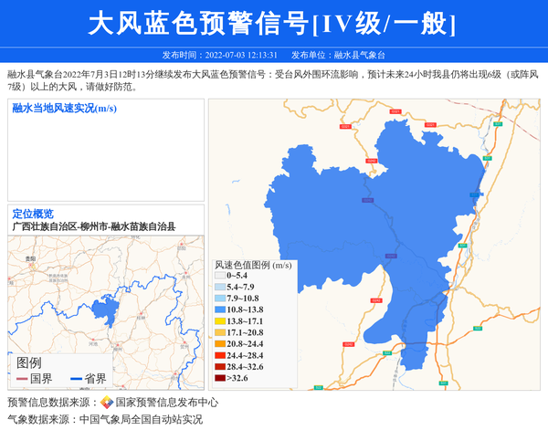 融水县气象台2022年7月3日12时13分继续发布大风蓝色预警信号:受台风外围环流影响,预计未来24小时我县仍将出现6级(或阵风7级)以上的大风,请做好防范。 信息来源:国家预警信息发布中心; 发布单位:融水县气象台。