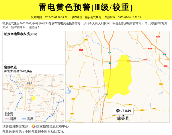柏乡县气象台2022年07月03日10时35分发布雷电黄色预警信号:预计今天白天到夜间,我县全部乡镇有雷阵雨天气,局地伴有短时大风、短时强降水。请防范! 信息来源:国家预警信息发布中心; 发布单位:柏乡县气象台。