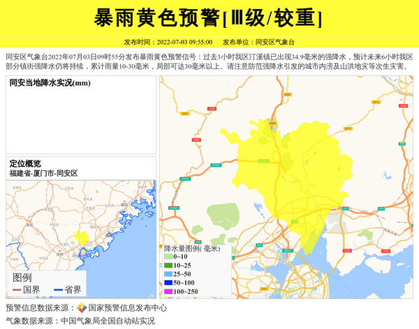 同安区气象台2022年07月03日09时55分发布暴雨黄色预警信号:过去3小时我区汀溪镇已出现34.9毫米的强降水,预计未来6小时我区部分镇街强降水仍将持续,累计雨量10-30毫米,局部可达30毫米以上。请注意防范强降水引发的城市内涝及山洪地灾等次生灾害。 信息来源:国家预警信息发布中心; 发布单位:同安区气象台。