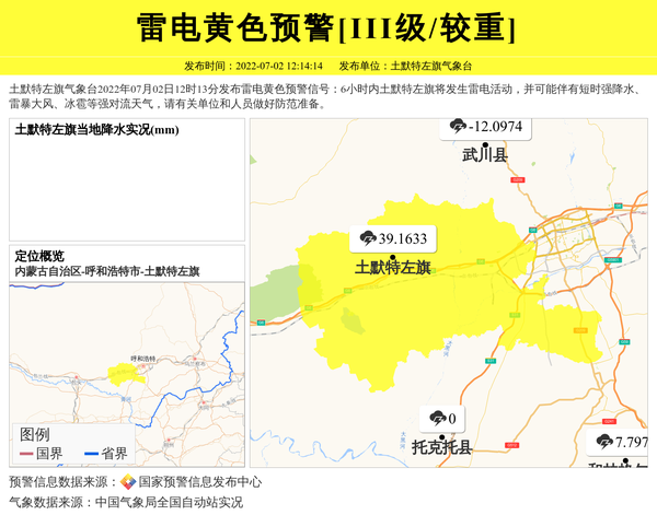 土默特左旗气象台2022年07月02日12时13分发布雷电黄色预警信号:6小时内土默特左旗将发生雷电活动,并可能伴有短时强降水、雷暴大风、冰雹等强对流天气,请有关单位和人员做好防范准备。 信息来源:国家预警信息发布中心; 发布单位:土默特左旗气象台。
