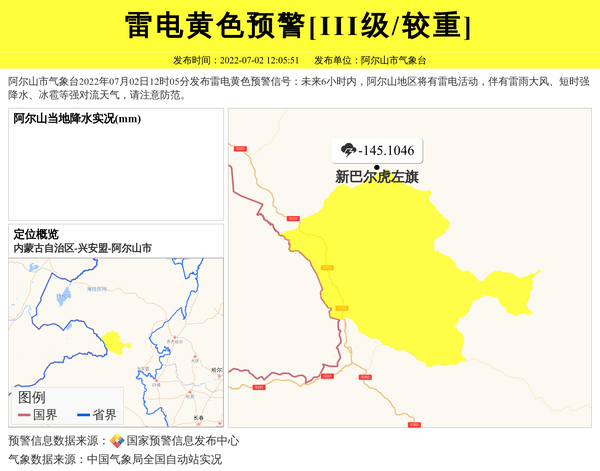 阿尔山市气象台2022年07月02日12时05分发布雷电黄色预警信号:未来6小时内,阿尔山地区将有雷电活动,伴有雷雨大风、短时强降水、冰雹等强对流天气,请注意防范。 信息来源:国家预警信息发布中心; 发布单位:阿尔山市气象台。
