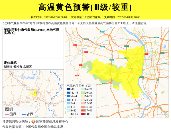 长沙市气象台2022年7月2日9时0分发布高温黄色预警信号:今天白天岳麓区最高气温将升至35℃以上,请注意防范。 信息来源:国家预警信息发布中心; 发布单位:长沙市气象局。