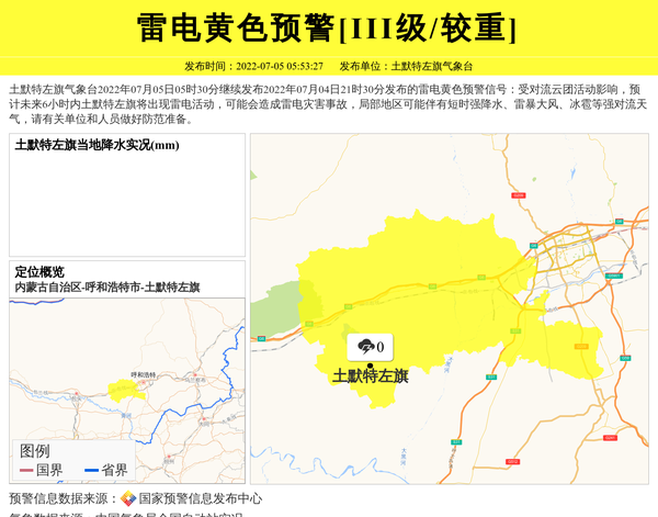土默特左旗气象台2022年07月05日05时30分继续发布2022年07月04日21时30分发布的雷电黄色预警信号:受对流云团活动影响,预计未来6小时内土默特左旗将出现雷电活动,可能会造成雷电灾害事故,局部地区可能伴有短时强降水、雷暴大风、冰雹等强对流天气,请有关单位和人员做好防范准备。 信息来源:国家预警信息发布中心; 发布单位:土默特左旗气象台。
