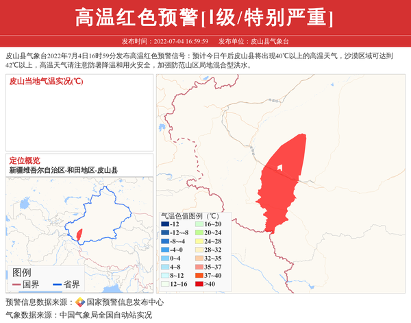 皮山县气象台2022年7月4日16时59分发布高温红色预警信号:预计今日午后皮山县将出现40℃以上的高温天气,沙漠区域可达到42℃以上,高温天气请注意防暑降温和用火安全,加强防范山区局地混合型洪水。 信息来源:国家预警信息发布中心; 发布单位:皮山县气象台。