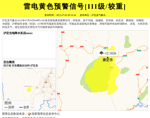 泸定县气象台发布雷电黄色预警信号[III级/较重]