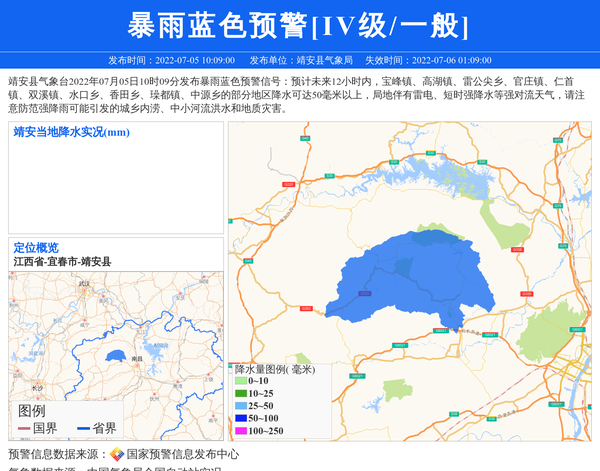靖安县气象台2022年07月05日10时09分发布暴雨蓝色预警信号:预计未来12小时内,宝峰镇、高湖镇、雷公尖乡、官庄镇、仁首镇、双溪镇、水口乡、香田乡、璪都镇、中源乡的部分地区降水可达50毫米以上,局地伴有雷电、短时强降水等强对流天气,请注意防范强降雨可能引发的城乡内涝、中小河流洪水和地质灾害。 信息来源:国家预警信息发布中心; 发布单位:靖安县气象局。
