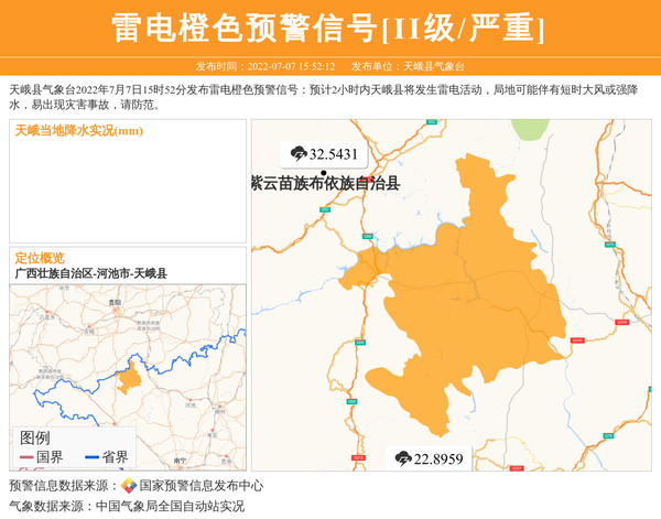 天峨县气象台2022年7月7日15时52分发布雷电橙色预警信号:预计2小时内天峨县将发生雷电活动,局地可能伴有短时大风或强降水,易出现灾害事故,请防范。 信息来源:国家预警信息发布中心; 发布单位:天峨县气象台。