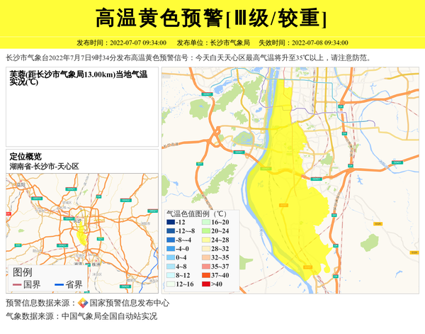 长沙市气象台2022年7月7日9时34分发布高温黄色预警信号:今天白天天心区最高气温将升至35℃以上,请注意防范。 信息来源:国家预警信息发布中心; 发布单位:长沙市气象局。