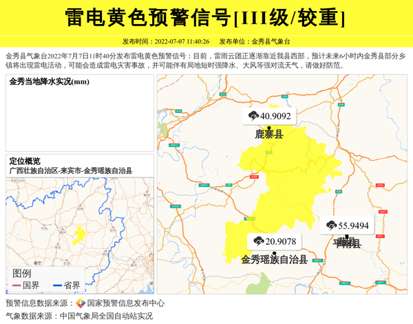 金秀县气象台2022年7月7日11时40分发布雷电黄色预警信号:目前,雷雨云团正逐渐靠近我县西部,预计未来6小时内金秀县部分乡镇将出现雷电活动,可能会造成雷电灾害事故,并可能伴有局地短时强降水、大风等强对流天气,请做好防范。 信息来源:国家预警信息发布中心; 发布单位:金秀县气象台。