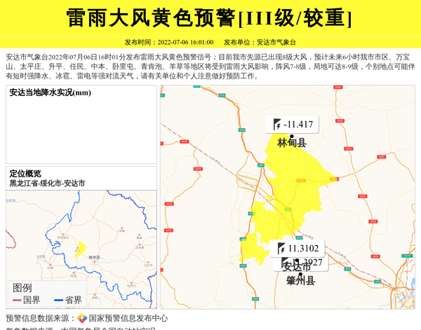 安达市气象台2022年07月06日16时01分发布雷雨大风黄色预警信号:目前我市先源已出现8级大风,预计未来6小时我市市区、万宝山、太平庄、升平、任民、中本、卧里屯、青肯泡、羊草等地区将受到雷雨大风影响,阵风7-8级,局地可达8-9级,个别地点可能伴有短时强降水、冰雹、雷电等强对流天气,请有关单位和个人注意做好预防工作。 信息来源:国家预警信息发布中心; 发布单位:安达市气象台。