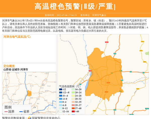河津市气象台2022年7月6日17时04分发布高温橙色预警信号,预警区域:所有乡、镇(街道)。预计24小时内最高气温将升至37℃以上,请有关单位和人员作好防范准备。防御指南:1.有关部门和单位按照职责落实防暑降温保障措施;2.尽量避免在高温时段进行户外活动,高温条件下作业的人员应当缩短连续工作时间;3.对老、弱、病、幼人群提供防暑降温指导,并采取必要的防护措施;4.有关部门和单位应当注意防范因用电量过高,以及电线、变压器等电力负载过大而引发的火灾。 信息来源:国家预警信息发布中心; 发布单位:河津市气象台。