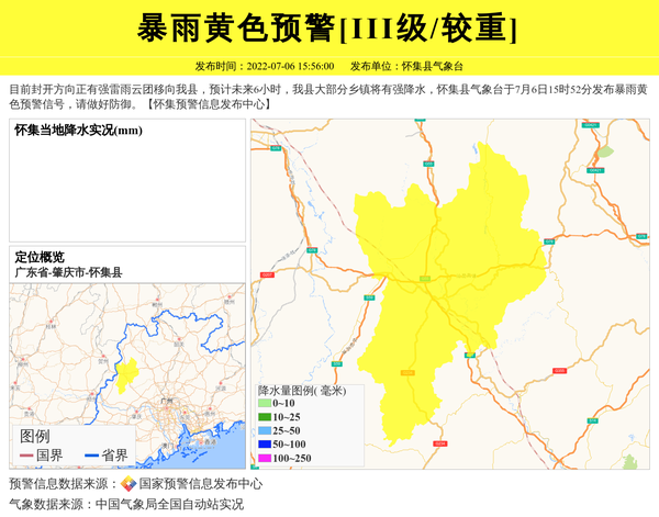 目前封开方向正有强雷雨云团移向我县,预计未来6小时,我县大部分乡镇将有强降水,怀集县气象台于7月6日15时52分发布暴雨黄色预警信号,请做好防御。【怀集预警信息发布中心】 信息来源:国家预警信息发布中心; 发布单位:怀集县气象台。