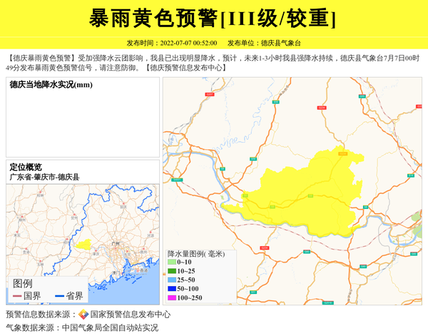 【德庆暴雨黄色预警】受加强降水云团影响,我县已出现明显降水,预计,未来1-3小时我县强降水持续,德庆县气象台7月7日00时49分发布暴雨黄色预警信号,请注意防御。【德庆预警信息发布中心】 信息来源:国家预警信息发布中心; 发布单位:德庆县气象台。
