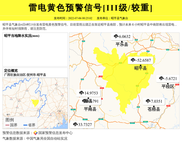 昭平县气象台6日0时25分发布雷电黄色预警信号。目前雷雨云团正在靠近昭平县南部,预计未来6小时昭平县中南部将出现雷电,并伴有短时强降雨,请注意防范。 信息来源:国家预警信息发布中心; 发布单位:昭平县气象台。