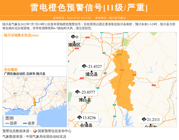 陆川县气象台2022年7月7日19时12分发布雷电橙色预警信号:目前雷雨云团正逐渐靠近陆川县南部,预计未来2-3小时,陆川县大部将自南向北出现雷电,并伴有强降雨和6-7级短时大风,请注意防范。 信息来源:国家预警信息发布中心; 发布单位:陆川县气象台。