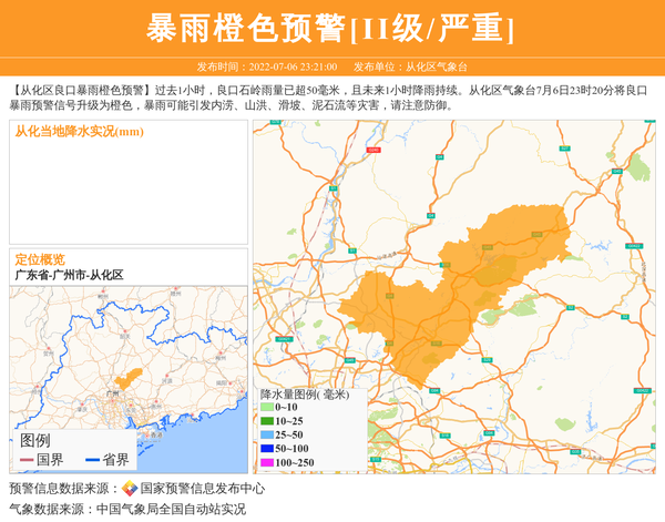【从化区良口暴雨橙色预警】过去1小时,良口石岭雨量已超50毫米,且未来1小时降雨持续。从化区气象台7月6日23时20分将良口暴雨预警信号升级为橙色,暴雨可能引发内涝、山洪、滑坡、泥石流等灾害,请注意防御。 信息来源:国家预警信息发布中心; 发布单位:从化区气象台。