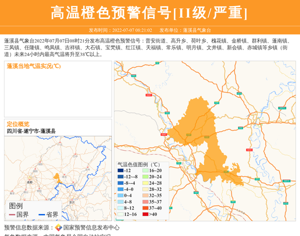 蓬溪县气象台2022年07月07日08时21分发布高温橙色预警信号:普安街道、高升乡、荷叶乡、槐花镇、金桥镇、群利镇、蓬南镇、三凤镇、任隆镇、鸣凤镇、吉祥镇、大石镇、宝梵镇、红江镇、天福镇、常乐镇、明月镇、文井镇、新会镇、赤城镇等乡镇(街道)未来24小时内最高气温将升至38℃以上。 信息来源:国家预警信息发布中心; 发布单位:蓬溪县气象台。