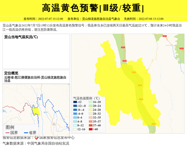 贡山县气象台2022年7月7日15时12分发布高温黄色预警信号:我县捧当乡已连续两天日最高气温超过35℃,预计未来24小时我县沿江一线高温仍将持续,请注意防暑降温。 信息来源:国家预警信息发布中心; 发布单位:贡山独龙族怒族自治县气象台。
