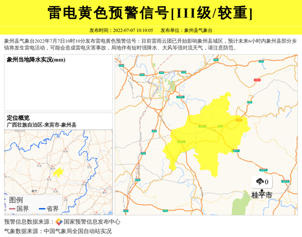 象州县气象台2022年7月7日10时10分发布雷电黄色预警信号:目前雷雨云团已开始影响象州县城区,预计未来6小时内象州县部分乡镇将发生雷电活动,可能会造成雷电灾害事故,局地伴有短时强降水、大风等强对流天气,请注意防范。 信息来源:国家预警信息发布中心; 发布单位:象州县气象台。