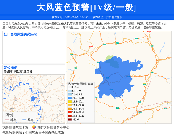 江口县气象台2022年07月07日16时02分继续发布大风蓝色预警信号:预计未来24小时内我县太平、德旺、怒溪、双江等乡镇(街道)将受到大风影响,平均风力可达6级以上,阵风7级以上,建议停止户外作业,远离玻璃门窗、危棚简屋、塔吊等建筑物。 信息来源:国家预警信息发布中心; 发布单位:江口县气象台。