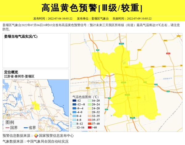 姜堰区气象台2022年07月06日10时03分发布高温黄色预警信号:预计未来三天我区所有镇(街道)最高气温将达35℃左右,请注意防范。 信息来源:国家预警信息发布中心; 发布单位:姜堰区气象台。