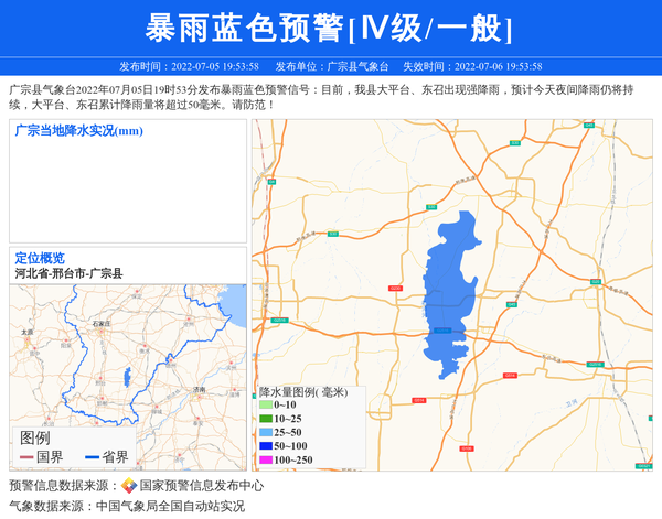 广宗县气象台2022年07月05日19时53分发布暴雨蓝色预警信号:目前,我县大平台、东召出现强降雨,预计今天夜间降雨仍将持续,大平台、东召累计降雨量将超过50毫米。请防范! 信息来源:国家预警信息发布中心; 发布单位:广宗县气象台。