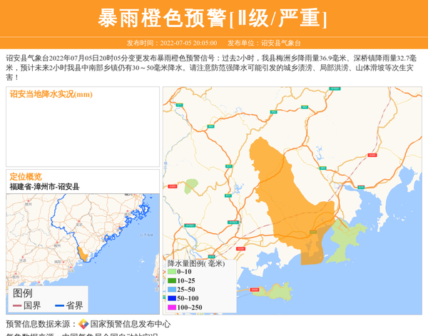 诏安县气象台2022年07月05日20时05分变更发布暴雨橙色预警信号:过去2小时,我县梅洲乡降雨量36.9毫米、深桥镇降雨量32.7毫米,预计未来2小时我县中南部乡镇仍有30~50毫米降水。请注意防范强降水可能引发的城乡渍涝、局部洪涝、山体滑坡等次生灾害! 信息来源:国家预警信息发布中心; 发布单位:诏安县气象台。